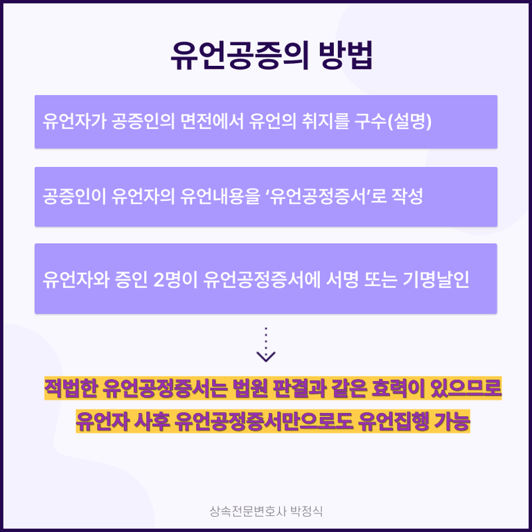 그러나 “유언공증(공정증서에 의한 유언)”의 경우, 국가로부터 공증인가를 받은 공증인이 직접 작성하여 유언자와 증인 2명의 서명 또는 기명날인을 받은 ‘유언공정증서’는 사실상 법원의 판결과 같은 공문서의 효력이 있기 때문에 위 4가지의 유언서와는 달리 위 유언공정증서만으로 바로 유언집행을 할 수 있습니다.