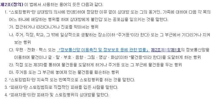 ‘스토킹(행위)’을 하면 무조건 처벌된다고 오해를 하는 경우가 많으나, ‘스토킹범죄의 처벌 등에 관한 법률’은 지속적 또는 반복적으로 스토킹 행위를 하는 경우에만 ‘스토킹 범죄’로 보아 처벌하고 있습니다.