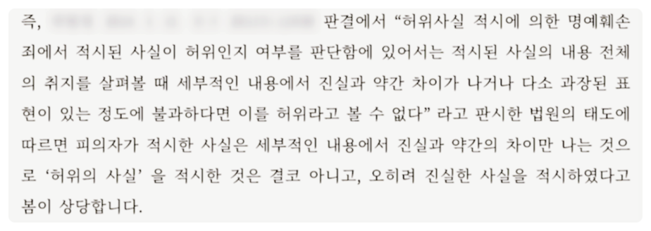 주된 내용이 사실이라면 법리와 판례에 따라 진실한 사실을 적시한 것이라는 것을 입증해 볼 여지가 있는 것이지요.