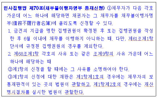 만약, 이러한 절차를 모두 거쳤음에도 채무자가 돈을 다 갚지 못했고 더 이상 집행할 재산도 발견할 수 없다면 신용불량자로 만드는 방법이 있습니다.