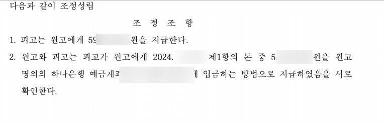 저희는 재판부에 조정을 열어달라고 하였고, 조정단계에서 원금 및 이자 뿐만 아니라, 저희 의뢰인이 변호사비도 들고 했으니 추가적인 비용을 더 지급하라고 하였습니다.