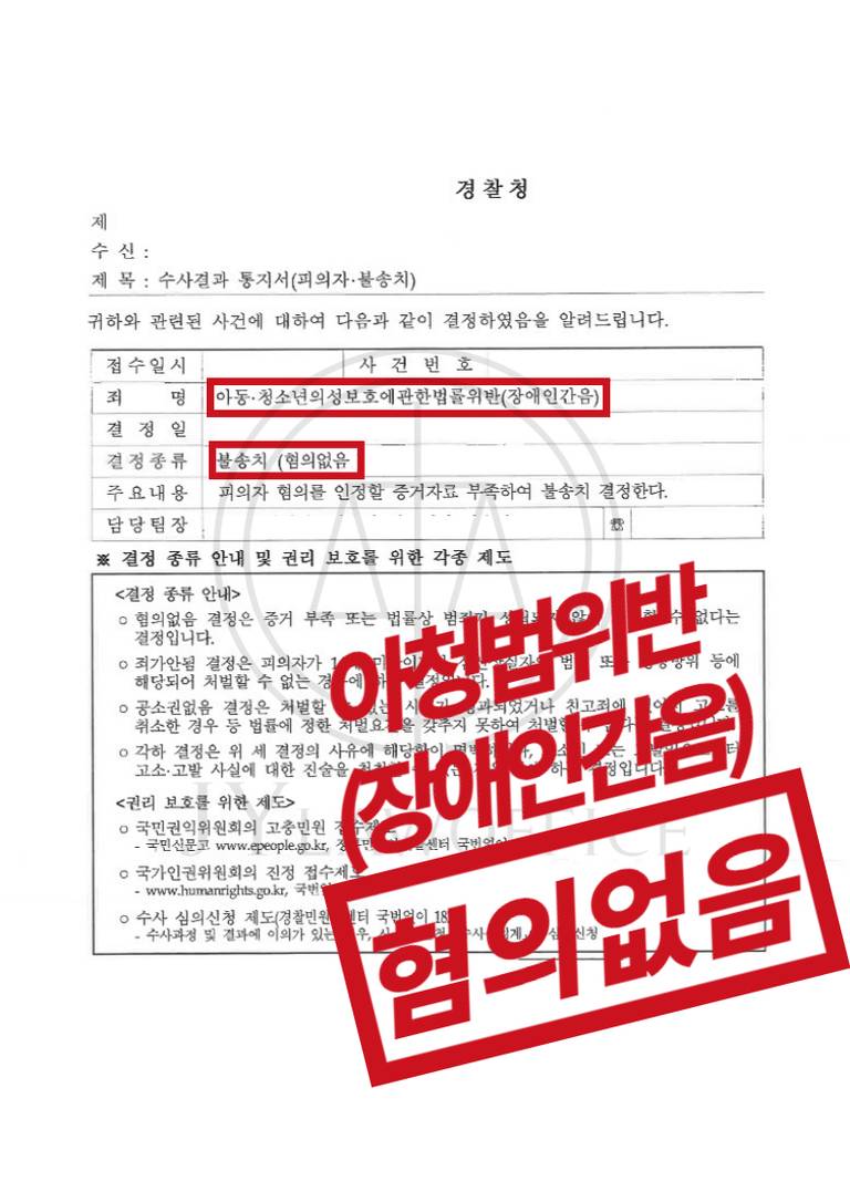 이와 같은 변호인의 노력에 따라, 의뢰인은 '아동ㆍ청소년의성보호에관한법률위반(장애인간음)' 혐의에서 혐의없음 처분을 받고 무사히 사건을 종결시킬 수 있었습니다.