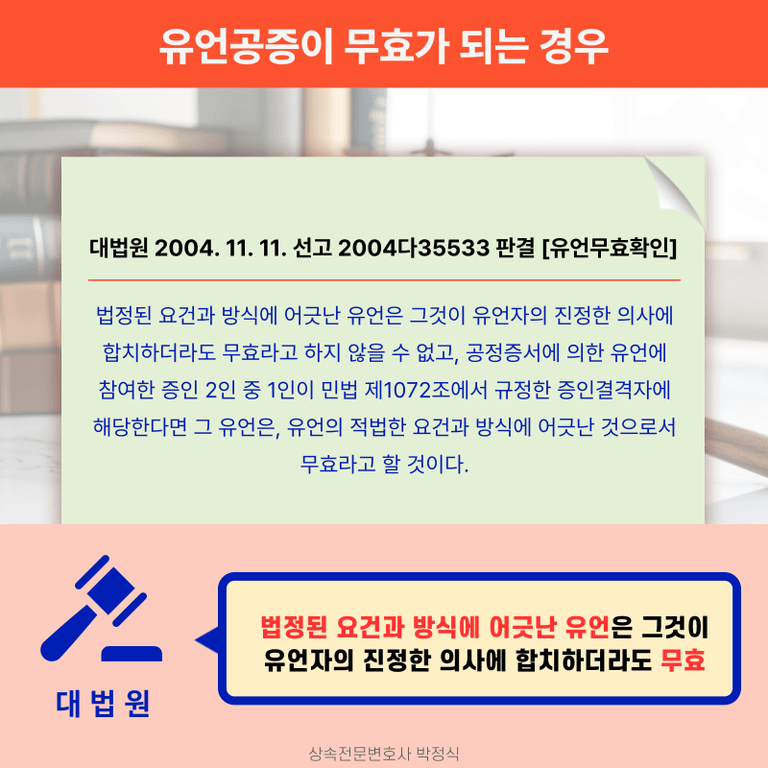 위와 같이 유언공증에 필요한 서류와 구체적인 유언공증의 방법과 절차에 대해서 자세히 알아보았지만, 최근에는 위와 같이 작성된 유언공정증서에 대해서 무효를 주장하는 사례가 종종 발생합니다.