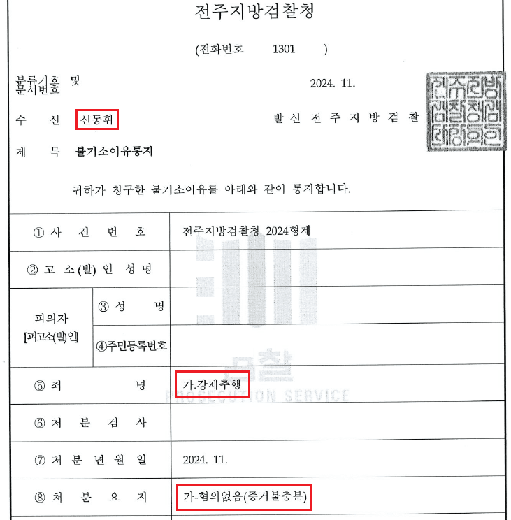 그 결과 검찰은 피의자에게 혐의없음(증거불충분) 처분을 하였습니다.