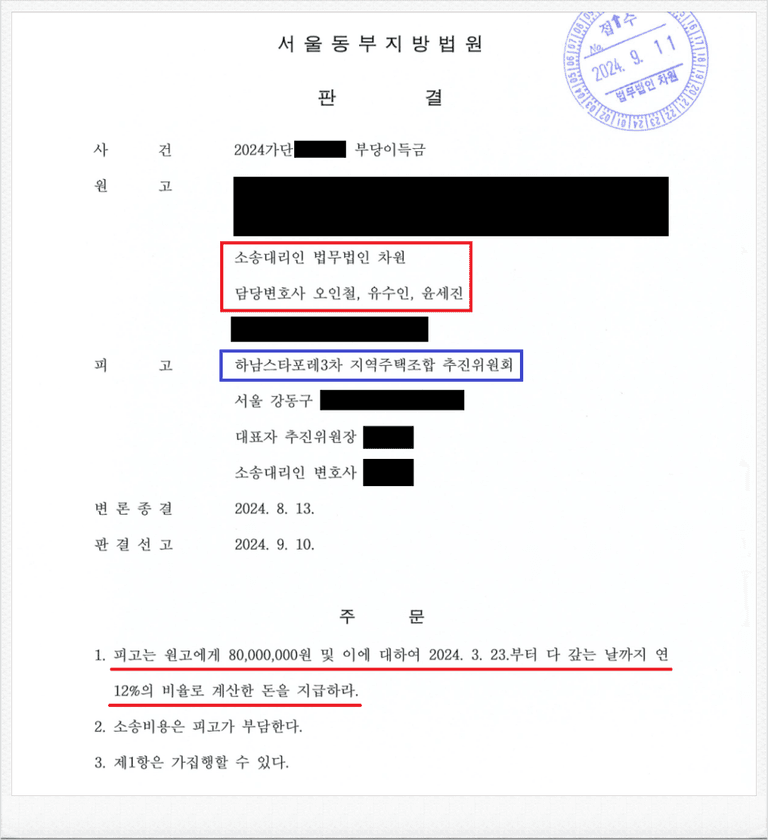 결국, 재판부는 이러한 저의 주장을 받아들였고, 피고는 의뢰인에게 80,000,000원 및 이에 대한 지연손해금을 지급하라는 내용의 판결을 이끌어 내었습니다.