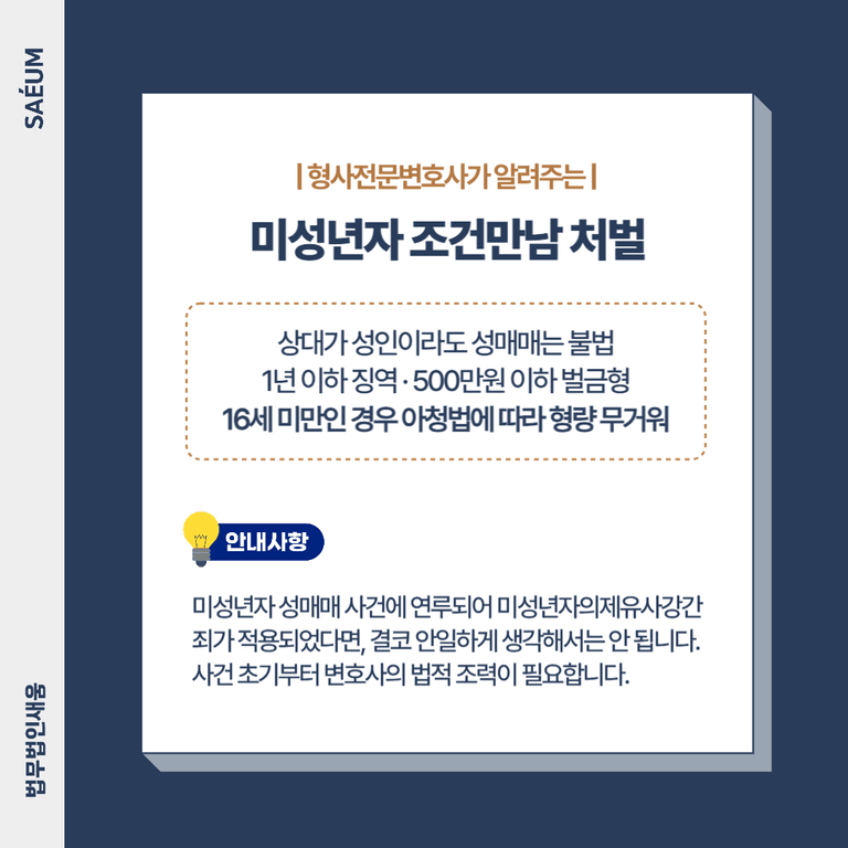 따라서 만일 자신이 미성년자 성매매 사건에 연루되어 미성년자의제유사강간죄가 적용되었다면, 결코 안일하게 생각해서는 안 됩니다.