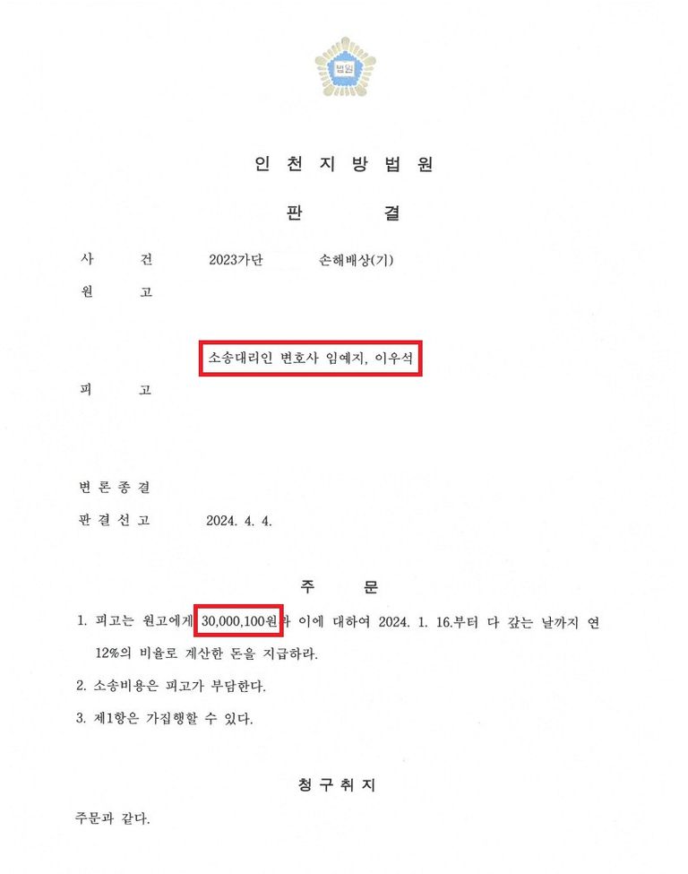 무변론 원고승소판결을 통해 저희 의뢰인은 청구한 3,000만원 전액을 위자료로 인정받는 전부 승소판결을 받을 수 있었습니다.