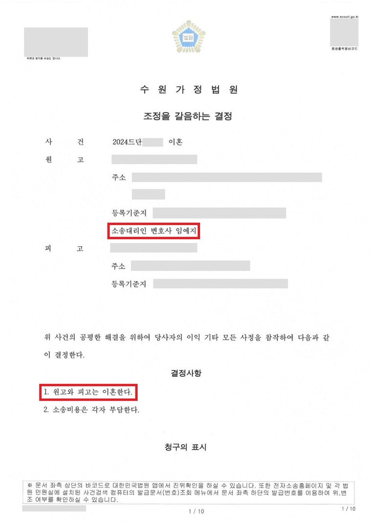 이혼소송을 제기하기 전까지는 남편쪽에서 내내 협의이혼에 불응하였으나, 소송이 제기되자 이혼조정기일에서 이혼의사에 대한 합치를 확인할 수 있었으며 이후 조정갈음결정을 통해 남편의 부채를 포함하여 각자 명의 재산은 각자에게 귀속되는 것으로 합의하여 저희 의뢰인은 남편의 부채로부터 안전하게 벗어날 수 있었습니다.