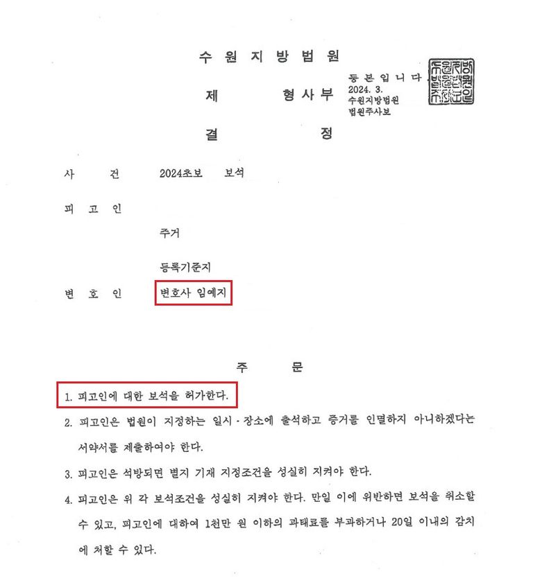 법률사무소 예우의 적극적인 조력으로 의뢰인은 보증금 없는 보석허가 결정을 받아 불구속 상태에서 재판을 받을 수 있었습니다.
