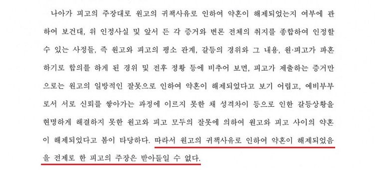 저희의 부당이득반환의 청구(본소)와 상대방의 위자료 청구(반소)의 모두 공통적으로 저희 의뢰인 A씨에게 약혼 파기에 대한 귀책사유가 있는지 그 여부가 쟁점이었습니다.