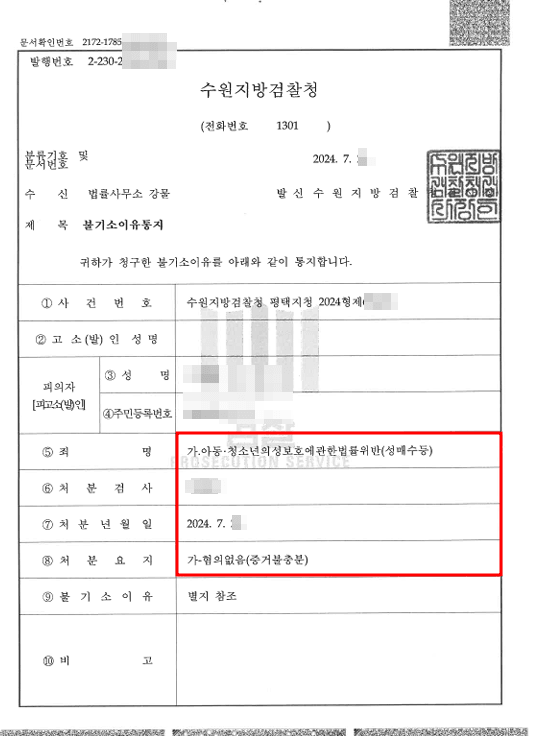검찰은 변호인의 의견을 받아들이고, 의뢰인의 성 구매 의사가 명확치 않다는 점에 동의 하여 의뢰인에 대한 성매수권유의 혐의에 대하여 불기소(혐의없음) 처분을 하였습니다. 의뢰인은 변호인의 조력을 통해 억울한 점을 소명하고 중한 처벌을 피할 수 있었습니다.