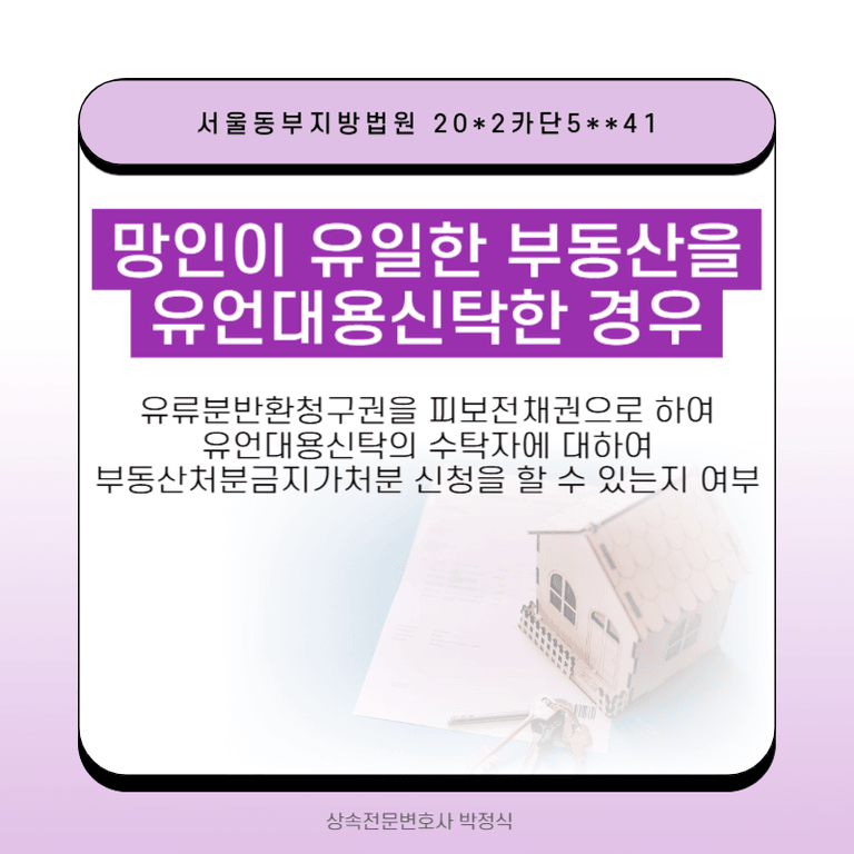 망인은 생전에 유일한 재산으로 이 사건 부동산을 소유하고 있었습니다. 망인은 사망하기 불과 40여 일 전에 이 사건 부동산을 장남의 처인 며느리에게 유언대용신탁을 하였는데, 차남인 채권자가 유류분반환청구권에 기한 소유권이전등기청구권을 보전하기 위하여 유언대용신탁의 수탁자에 대하여 부동산처분금지가처분 신청을 하였습니다.