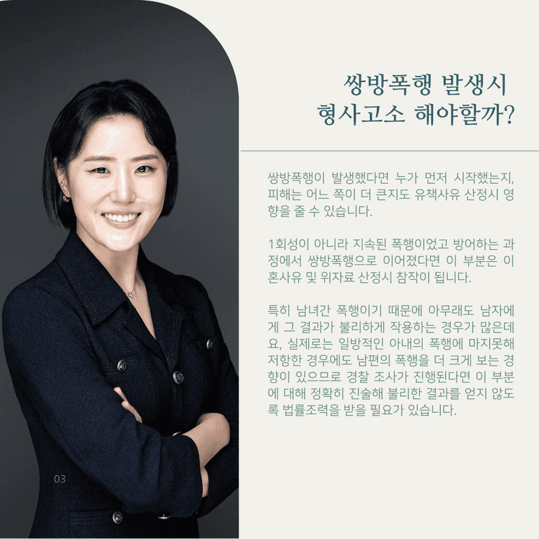 만일 객관적으로 두 사람 모두에게 책임이 있다고 여겨진다면 경찰 조사과정에서 이부분에 대한 진술을 명확히 하고 구체적인 증거를 제출해 형사사건 발생의 원인이 두 사람 모두에게 있음을 입증하거나 형사처분을 상대방보다 낮은 수위로 받을 수 있도록 해야 향후 이혼소송에서 유리한 결과를 얻을 수 있습니다.