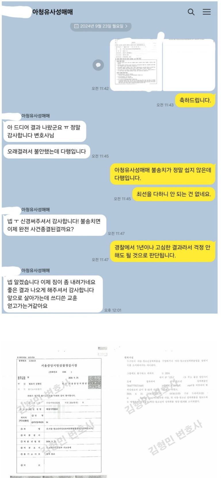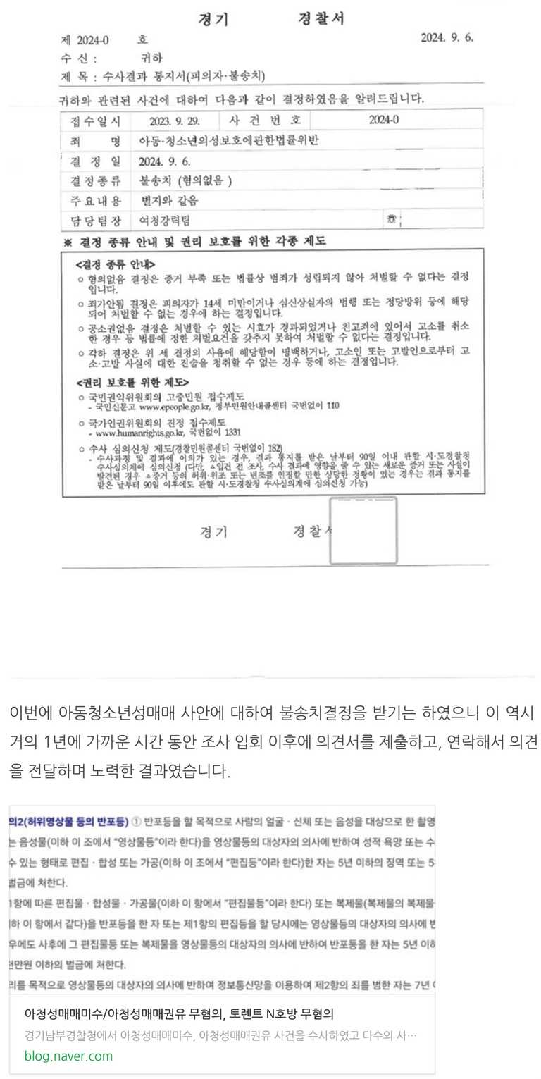 최근 제가 받은 아동청소년성매매 사건의 혐의없음 불기소이유서를 참고자료로 제출한 이후 결국 혐의없음 불송치 결정을 받을 수 있었는데 아동청소년성매매 사안은 한 건 무혐의 받기가 쉽지 않음을 다시 한번 느낄 수 있었습니다.