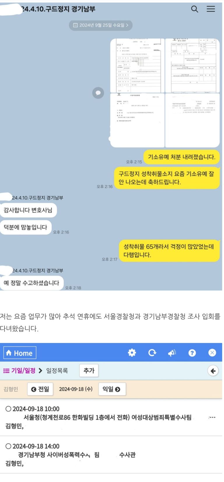 경찰 조사에서 65개 이외에 추가되는 아동성착취물은 없는 것으로 조사는 잘 이루어졌고 조서 역시 최대한 선처 받을 수 있도록 잘 작성되었습니다. 양형에 참고할 수 있는 다수의 샘플들을 포함하여 자료를 제공하여 주고 사소한 반성문도 제출 전에 제가 직접 검수하여 수정하게 하는 등 최선을 다한 결과 기소유예라는 결과를 받을 수 있었습니다. 의뢰인들이 보통 여경, 여검, 여판이라고 지칭하면서 성별을 구분하여 여자인 분들을 극도로 경계하는 모습을 보이는 경우가 있으나 제가 이번에 기소유예를 받은 이 사건의 검사님이 여자 검사님인 것처럼 너무 성별을 기준으로 경계를 할 필요는 없을 것입니다. 무엇보다 성별이 여자이니 교체해달라고 할 수도 없는 노릇이고 실질적인 의미도 없는 것입니다.