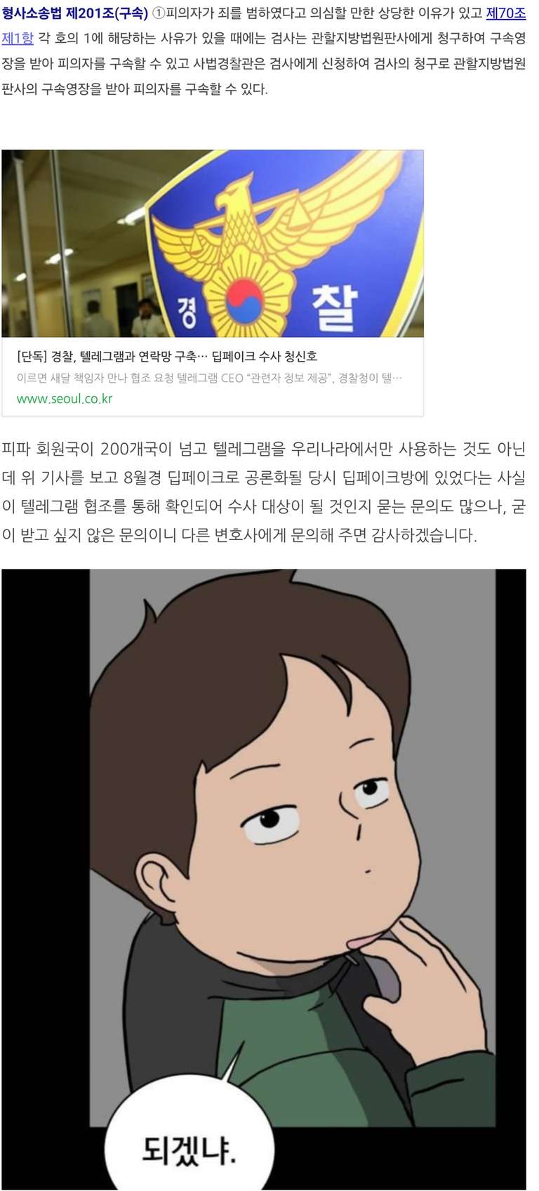 딥페이크로 문의가 많은데 지금 상황에서는 뭐가 사건화가 되냐는 문의만 많아 품만 들고 실속이 없는 것이 사실입니다. 물론 지금 서울경찰청에서 딥페이크 유포 관련하여 이미 압수수색이 이루어진 사안도 있고 변호하고 있는 건도 있기는 합니다. 반복 상담, 중복 상담은 받지 않고 있기 때문에 저에게 한 번 문의를 했는데 추가 의문이 있다면 다른 변호사에게 문의하면 될 것입니다. 초전도인지 울트라맨인지 뭔 글을 올렸고 IP 관련하여 수사 대상이 되냐는 문의를 다수 받았는데 제가 이런 영양가 없는 문의들로 아까운 시간을 낭비하고 있습니다. 딥페이크 범죄 수사하고 있는데 끝도 없이 나온다, 앞으로 자주 볼 것 같다는 말을 들었는데 빨리 좀 스타트를 하면 이런 소모적인 문의는 없어지지 않을까 싶습니다.