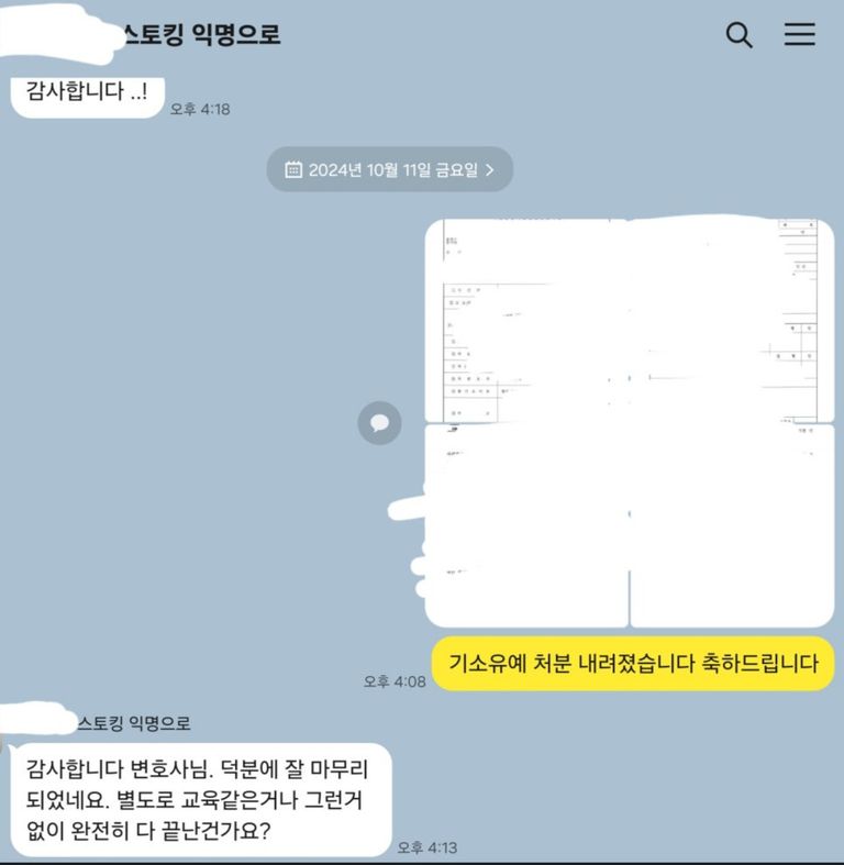 다만 이번 사안과 같이 익명으로 거절에도 불구하고 계속된 연락을 한 경우에는 무혐의가 어려운 것이 사실입니다. 인스타 계정을 새로 파서, 또는 트위터 계정을 새로 파서, 평소 사용하지 않는 카카오톡 오픈채팅을 파서 익명으로 연락을 하는 경우가 스토킹처벌법위반 사안에서는 자주 있습니다. 익명으로 계속 연락을 하였다가 특정되는 경우에는 무혐의에 난점이 있으며 정통법위반 등 추가 범죄로까지 처벌될 우려도 있는 것이 사실입니다.