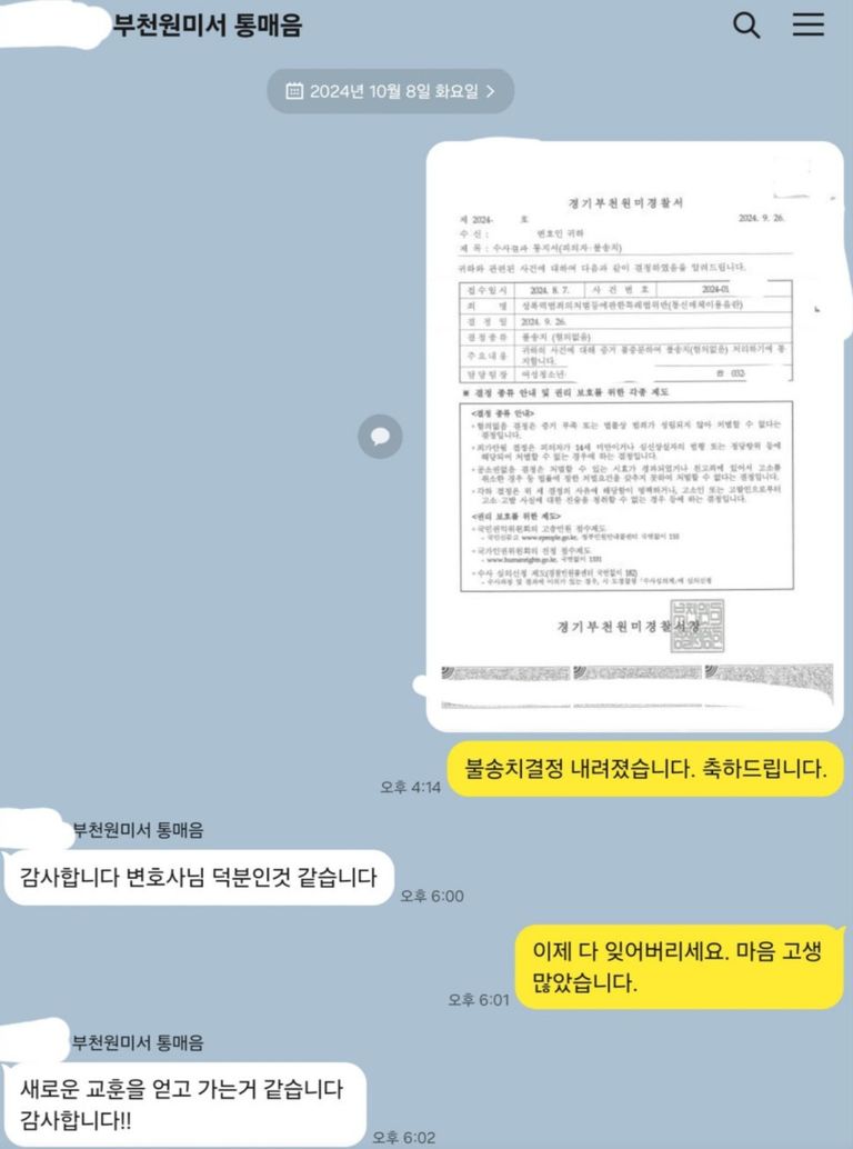 추가로 시도하였던 합의 시도에서는 실제로는 멀리 떨어진 장소에 있었다는 점을 잘 설명하고 의뢰인의 경제적 사정에 대하여 양해를 간절히 구한 결과 결국 합의에 이를 수 있었습니다. 걱정이 되었던 것은 교육이수였는데 직장을 다니는 사람들에게도 이 역시 큰 이해관계가 있는 것입니다. 검사님에게 사정을 잘 전달하였고 결과적으로 교육이수 없는 기소유예로 마무리할 수 있었습니다.