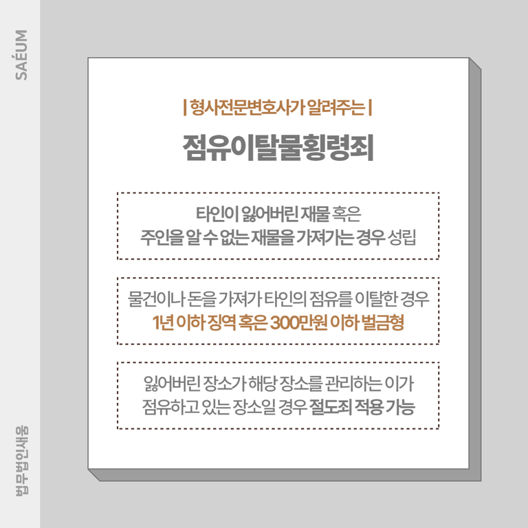 요즘은 아무리 원래 소유자가 제대로 간수를 하지 못해 잃어버린 물건이라고 해도 가져가는 순간 바로 점유이탈물횡령죄가 적용되기 때문에 주의해야 합니다.