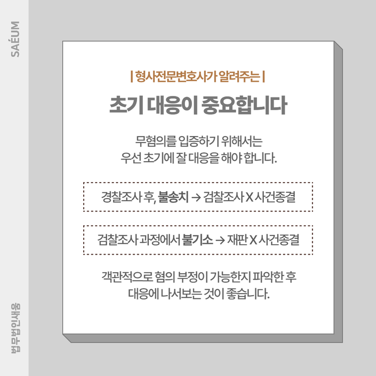 이때 초기에 대처를 잘하면 경찰조사 과정에서 불송치가 되어 검찰로 송치되는 것을 막을 수 있습니다. 불송치 혹은 불기소 등을 받게 되면 다음 단계로 수사가 넘어가지 않기 때문에 빠르게 사건을 마무리 지을 수 있습니다.