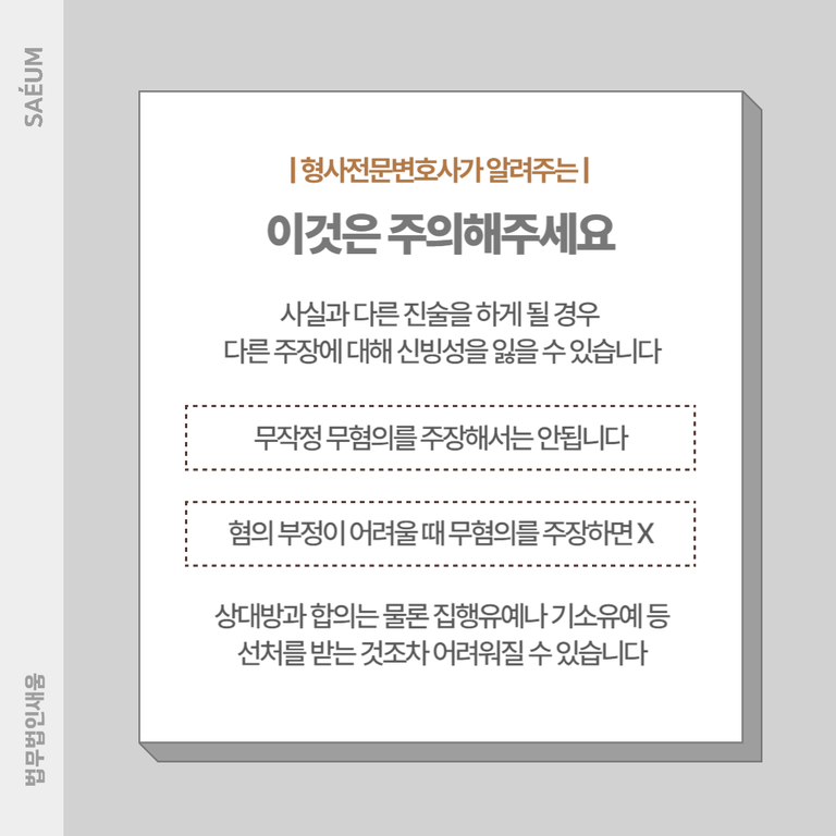 또한 혐의를 부인할 수 없는 상황에서 무리하게 무혐의를 주장하지 않도록 주의해야 합니다. 혐의 부정을 못하는 상태에서 죄가 없다며 혐의부정을 할 경우 반성을 하지 않는다고 보여질 수 있으며, 상대방과 합의가 어려워짐에 따라 집행유예나 기소유예 등의 선처를 받는 것조차 힘들어질 수 있습니다. 그렇기에 사전에 객관적으로 혐의 부정이 가능한지 파악한 후에 대응에 나서보는 것이 좋습니다.