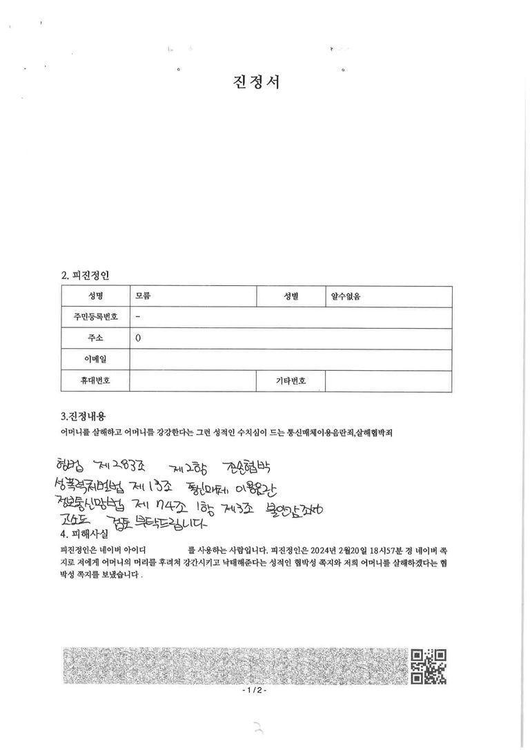 이에 피해자는 피의자를 존속협박죄, 정보통신망법 상 불안감 조성죄, 통신매체이용음란죄로 형사고소 하였습니다.