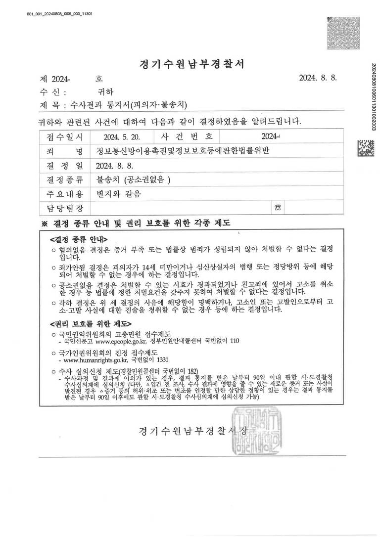 정보통신망법 상 불안감 조성죄에 대하여는 피해자가 압박을 느꼈는 지, 합의나 사과를 전혀 하지 않았음에도 피해자 스스로 고소를 취하하여 버렸습니다. (불안감 조성죄는 반의사불벌죄 이기에 피해자의 고소취하로 인하여 공소권 없음 처리가 되었습니다.)