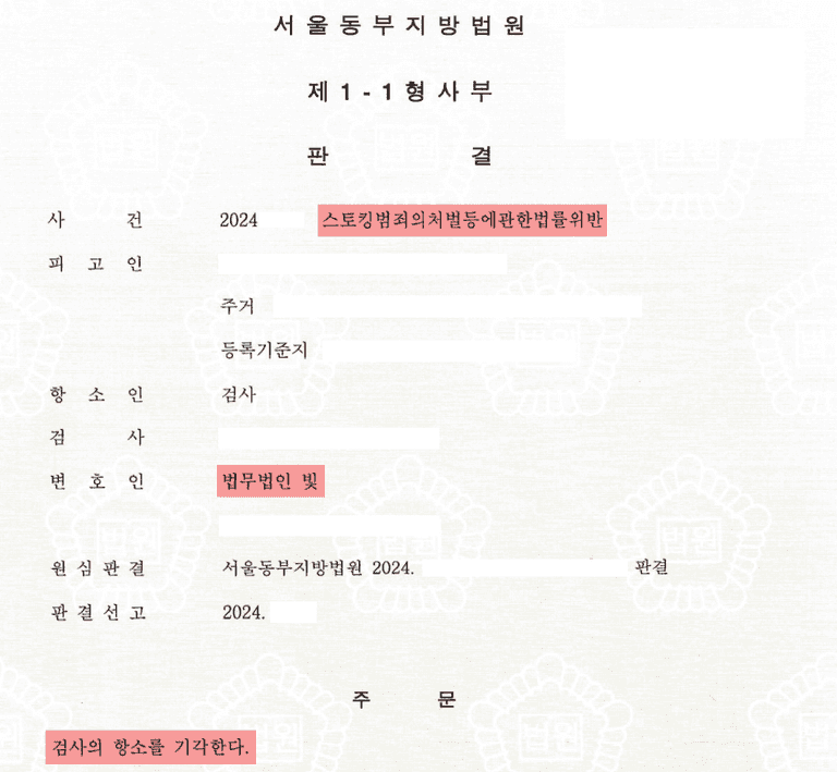 저희가 1심에서 적극적으로 조력해 스토킹 무죄 판결을 받았지만,
