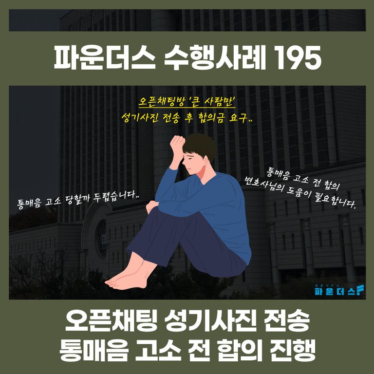 오픈채팅방을 둘러보던 중 ‘큰 사람만’ 이라는 방 제목을 보고 채팅방에 접속한 의뢰인은 성기사진을 보내게 되었고 상대로부터 고소 진행 전 합의금 요구를 받아 변호인의 조력을 요청하게 되었습니다.