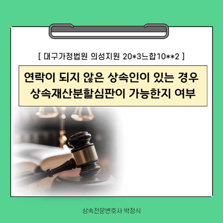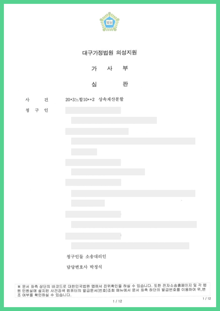 저는 청구인들을 대리하여 대구가정법원 의성지원에 상속재산분할심판청구를 제기한 사건입니다.