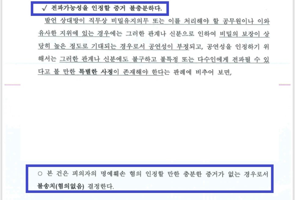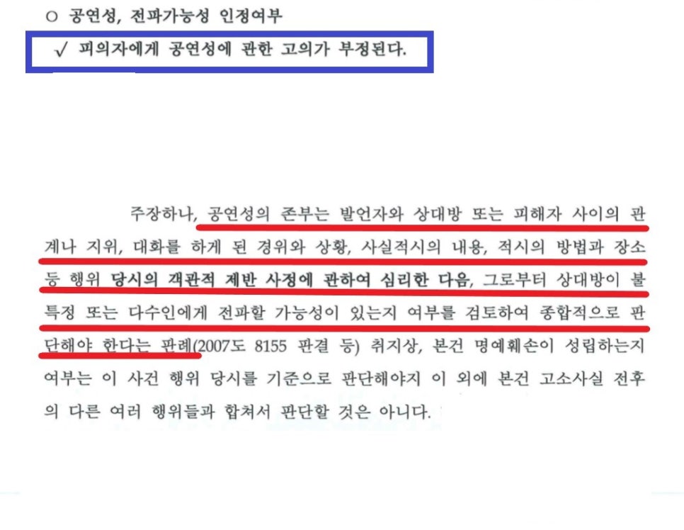 조사를 마친 뒤, 저는, '공연성의 존부는 발언자와 상대방 또는 피해자 사시의 관계나 지위, 대화를 하게 된 경위와 상황, 사실적시의 내용, 적시의 방법과 장소 등 해위 당시의 객관적 제반 사정에 관하여 심리한 다음, 그로부터 상대방이 불특정 또는 다수인에게 전파할 가능성이 있는지 여부를 검토하여 종합적으로 판단하여야 한다'는 판례(대법원 2007도 8155판결), '발언 상대방이 직무상 비밀유지의무 또는 이를 처리해야 할 공무원이나 이와 유사한 지위에 있는 경우에는 그러한 관계나 신분으로 인하여 비밀의 보장이 상당히 높은 정도로 기대되는 경우로서 공연성이 부정되고, 공연성을 인정하기 위해서는 그러한 관계나 신분에도 불구하고 불특정 또는 다수인에게 전파될 수 있다고 볼 만한 특별한 사정이 존재해야 한다'는 판례(대법원 2015도15619판결)를 근거로, A씨는 이 사건 당시 학원 선생님이 이 사건 학교폭력 사실에 대해서 물어보자 이에 대한 답변을 했을 뿐이라는 점, A씨는 B군이 C군과 학원 등에서 마주치지 않았으면 하는 마음에 학원 선생님에게 위 말을 하게 되었다는 점, 이 사건 당시 A씨와 학원 선생님이 이야기를 나눌 때 함께 학원을 방문했던 친한 엄마만 있었을 뿐이며, 학원강사는 직무상 비밀유지의무가 있으므로 전파가능성을 인정할 수 없어 공연성을 인정할 수 없다는 점 등을 적극적으로 어필하는 내용의 변호인의견서를 수사기관에 여러 차례 제출하였습니다.