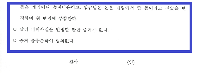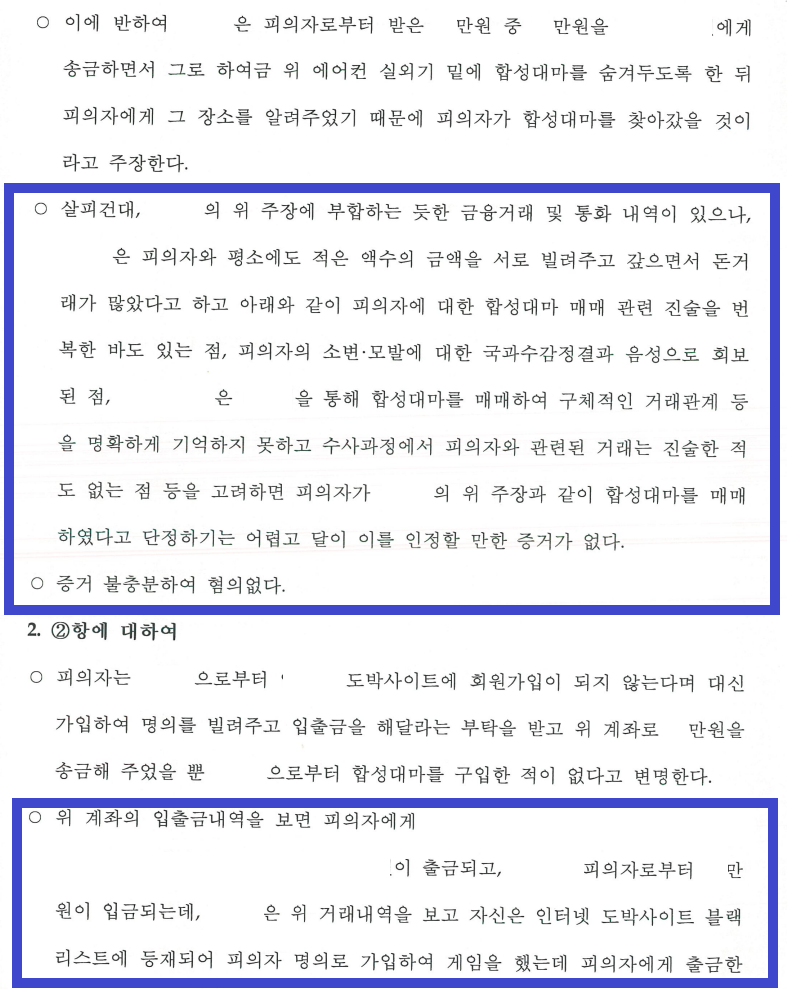 조사를 마친 뒤, 저는 A씨는 B씨의 요구에 돈을 빌려주었을 뿐이라는 점, A씨는 소변·모발 검사에서 '음성'으로 나왔다는 점, B씨가 A씨의 명의·계좌로 도박 사이트 가입을 요구하자, A씨는 B씨의 요구에 응해 도박 사이트에 가입해주었으며 B씨로부터 계좌로 받은 돈을 게임머니로 충전해주고 B씨가 게임을 하면서 딴 돈을 B씨의 계좌로 보내주었을 뿐이라는 점, B씨는 처음에는 A씨와 함께 합성대마를 구매하였다고 주장했으나 진술을 번복하였다는 점, B씨는 유리한 양형자료를 만들기 위해서 A씨와 함께 합성대마를 투약했다는 취지로 진술한 것으로 보인다는 점 등을 적극적으로 어필하면서 '이 사건 당시 A씨는 합성대마를 구매한 사실이 전혀 없다'는 내용의 변호인의견서를 수사기관에 수차례 제출하였습니다.
