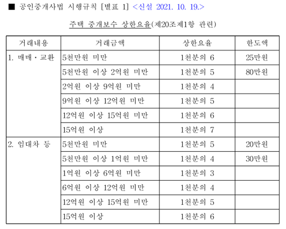 아래 표와 같은 상한요율 범위 내에서 중개의뢰인과 공인중개사가 협의하여 결정하도록 규정되어 있습니다.