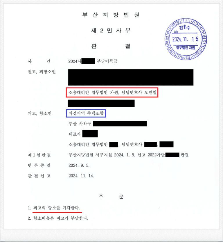 그러나 이와 같은 법원의 판결에도 피고 괴정지역주택조합 측은 패소를 인정하지 못하고, 항소하였습니다.