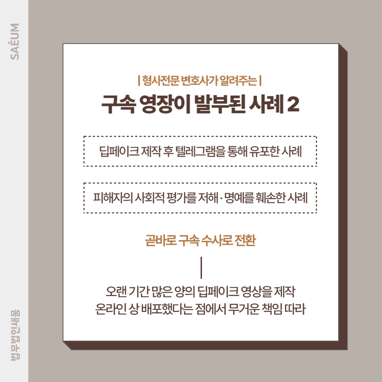관련하여 오늘은 딥페이크 사례 중 구속영장의 발부가 이루어진 사례를 토대로 범죄에 휘말렸을 때 어떻게 대응해야 하는지 알려드리고자 합니다. 먼저 해당 내용은 실제를 바탕으로 한 것으로, 현실적이고 냉정하게 어떠한 처벌에 이르게 되는지 드러냅니다.