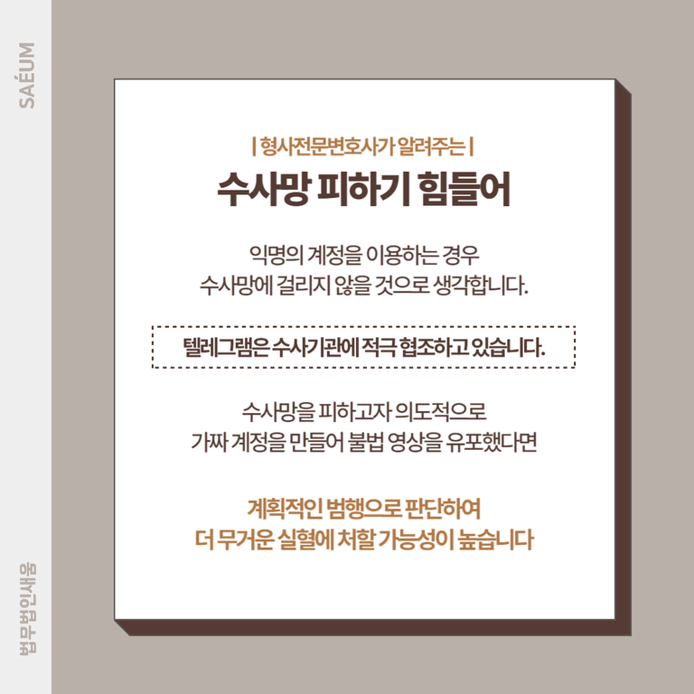 우선 텔레그램의 경우 수사기관이 요청할 때 적극적으로 자료를 제공하여 가해자를 검거하는 데 협조합니다. 따라서 수사망을 피하고자 의도적으로 가짜 계정을 만들어 사용하였다가 걸리면 더욱 계획적인 범행을 벌였다고 판단하여 무거운 실형에 처할 가능성이 커집니다.