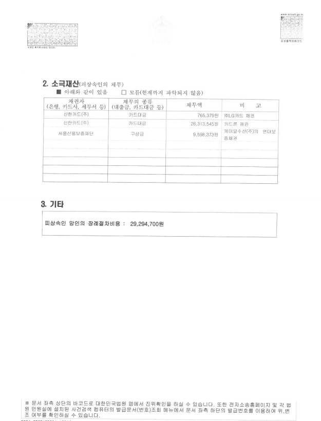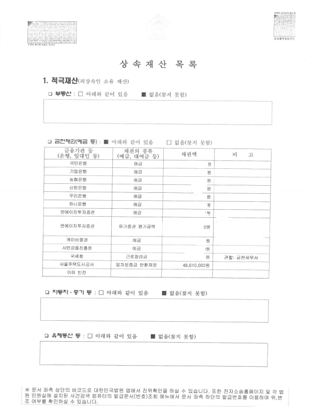 본 사안의 경우 망인이 사망시 적극재산으로는 임대차보증금 약 4,800만원이 전부였고, 소극재산 즉 채무는 약 2,700만원이 전부였습니다. 앞서 말씀드린 바와 같이 서울회생법원은 실무준칙을 개정하여 상속재산파산의 경우 상속인이 망인의 피부양가족이었다면 위 임대차보증금을 변제재산에서 제외할 수 있을 것이나 문제는 상속재산파산의 경우 원칙적으로 신청을 하기 위해서는 재산보다 채무가 많아야 한다는 점이었습니다.