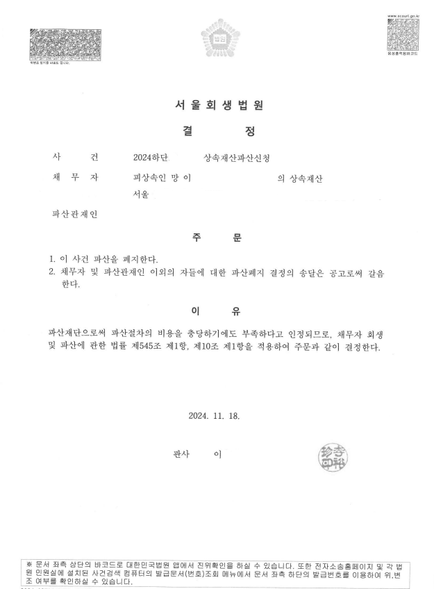 이에 본 법률사무소에서 의뢰인을 대리하여 상속재산파산신청을 한 결과 법원에서도 재산이 채무보다 많다는 이유로 이에 대한 소명을 하고 소명이 안될 시 취하를 할 것을 권고하였으나, 본 법률사무소는 서울회생법원의 개정된 실무준칙에는 포함되어 있지 않지만, 개인파산과의 형평상 그리고 상속재산 파산신청의 채무초과 여부를 판단하는데 있어 임대차보증금을 적극재산으로 반영하는 경우 실질적으로 채무가 적은 망인을 채무가 많은 망인보다 덜 보호하는 기이한 결과가 된다는 것을 적극으로 주장함으로써 결국 상속재산 파산이 이루어지고 상속파산관재인 역시 채권자들에게 임대차보증금을 전혀 배당하지 않는 것으로 사건이 종결되었습니다.