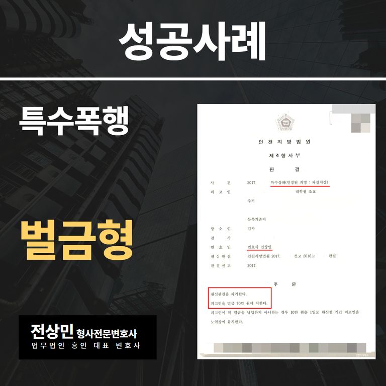 그 결과 항소심 법원에서는 의뢰인이 연루된 특수폭행 혐의를 과실치상으로 변경해주었고, 당시 징역형이 선고된 의뢰인에게 70만원의 벌금형이라는 판결을 선고하며, 좋은 결과를 얻을 수 있게 되었습니다.