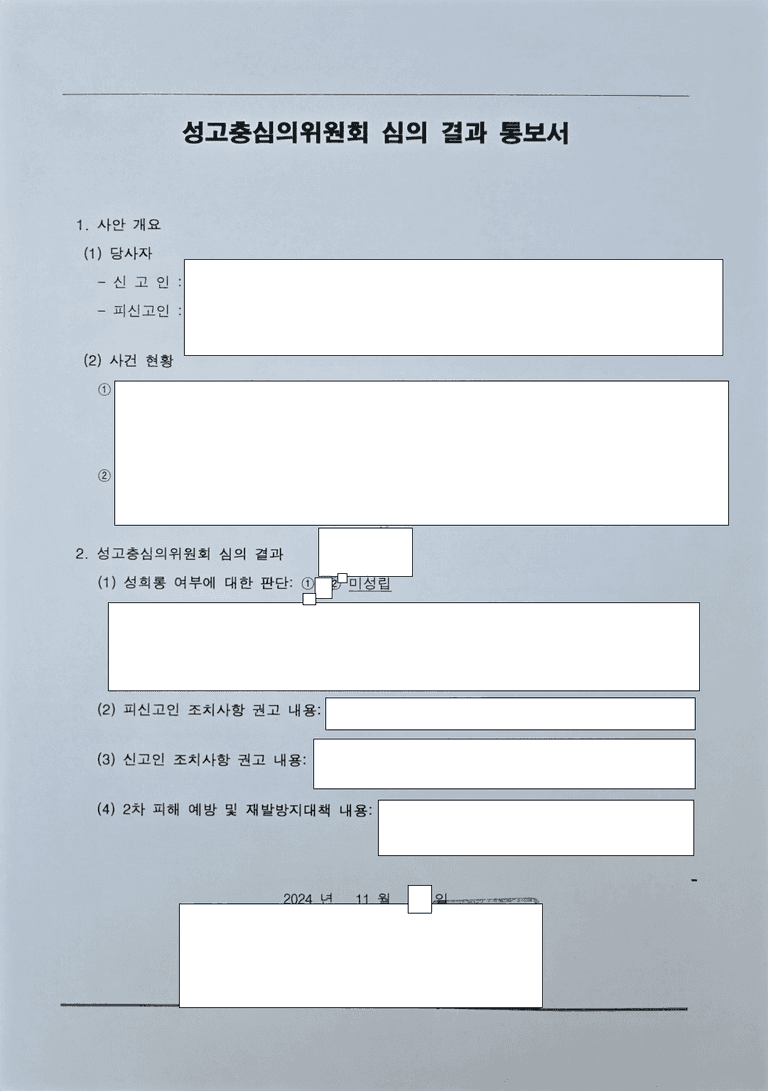 심제원 변호사입니다. 2024년 11월 또 다시 성희롱 미성립 결정을 받았습니다. 군인 성고충심의원회에서 해당 발언이 성희롱으로 인정하기 어렵다고 판단을 한 것입니다.