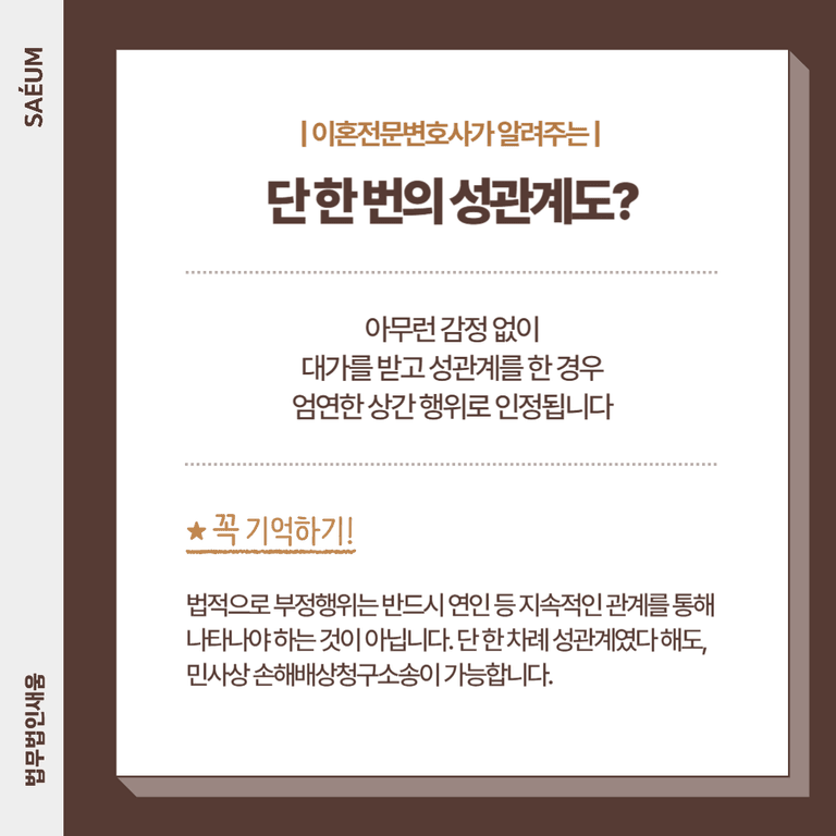 결론적으로 말씀을 드리자면, 아무런 감정 없이 대가를 받고 하룻밤을 보냈다 하더라도 이는 엄연한 상간 행위가 맞습니다. 법적으로 부정행위는 반드시 연인 등 지속적인 관계를 통해 나타나야 하는 것이 아닙니다.