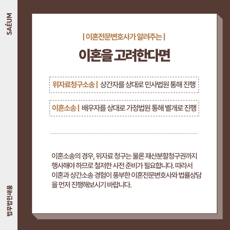 상간녀를 상대로 한 위자료청구소송은 민사 법원을, 배우자를 상대로 한 이혼소송은 가정법원을 통해 별개로 진행해야 합니다. 후자의 경우 위자료 청구를 비롯해 재산분할청구권까지 행사해야 하므로 보다 철저한 사전 준비가 필요합니다.