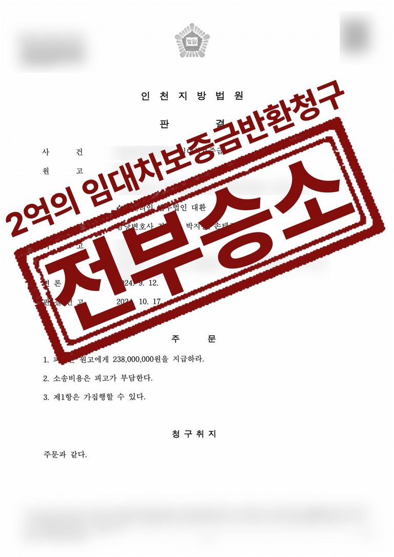 이를 알게 된 의뢰인이 법무법인 대환을 찾아주셨습니다. 법무법인 대환에서는 계약이 만료된 시점에서 보증금을 계속 미루고 있는 상황임을 인지하여 즉시 임대차보증금반환청구소송을 진행하였습니다. 또한, 부동산 중개업자도 공인중개사법을 위반하였기에 공모한 두 사람 모두가 손해배상책임을 져야 한다고 적극 주장하였습니다. 결과적으로 청구했던 모든 주장이 받아들여져 2억4천여 만원의 보증금반환소송에서 전부승소하였습니다.