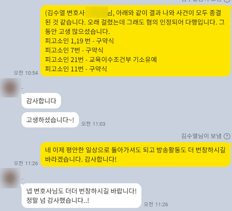 그 결과, 피고소인들은 각자 수사를 받아 일부는 진지한 사과를 통한 합의, 일부는 구약식으로 처벌시키는 쾌거를 이뤄냈습니다.