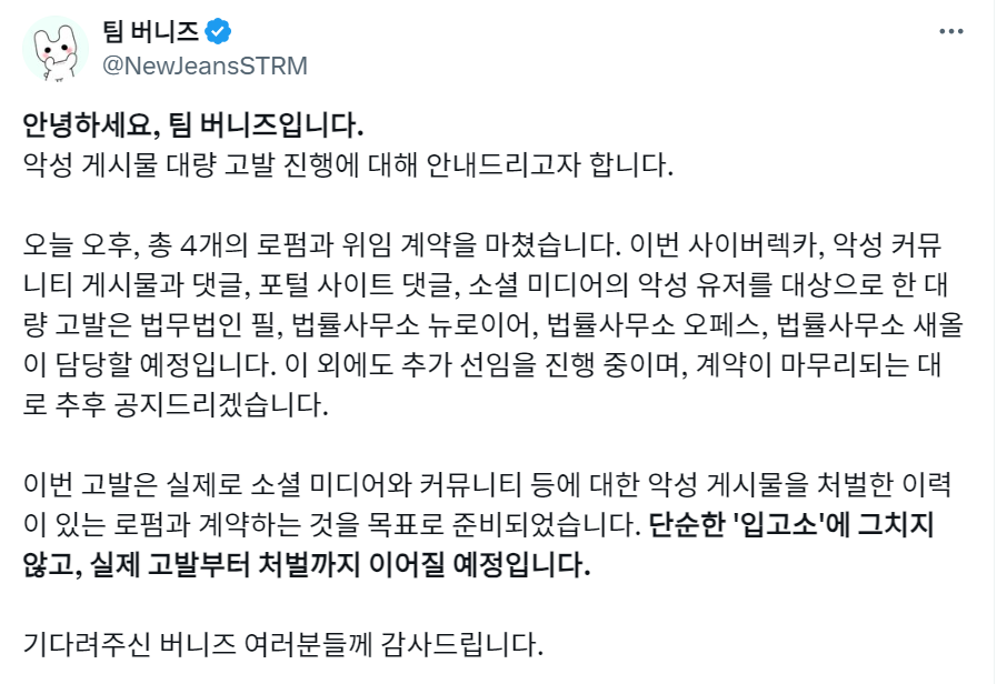 저희 뉴로이어는 뉴진스 악플고발 등 다수의 악플고소를 전문적으로 담당하고 있습니다.