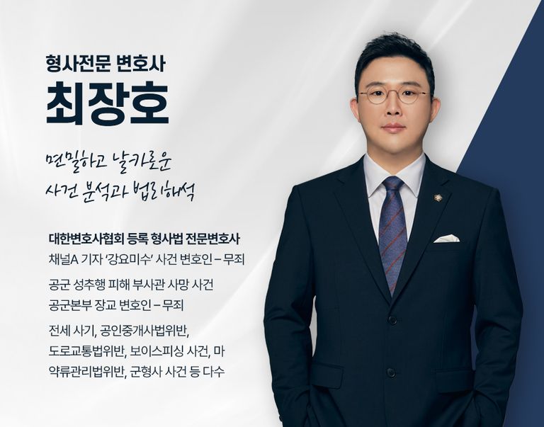 최장호 변호사는 대한변호사협회 등록 형사법 전문변호사로, 채널A 기자 ‘강요미수’사건 변호인(무죄), 공군 성추행 피해 부사관 사망 사건 공군본부 장교 변호인 (무죄), 전세 사기, 공인중개사법위반, 도로교통법위반, 보이스피싱 사건, 마약류관리법위반, 군형사 사건 등 여러 사건을 성공적으로 해결한 경험을 가지고 있습니다. 상담부터 사건 마무리까지 모두 직접 관리하고 있으니 도움이 필요하신 분들은 언제든 연락 주시기 바랍니다.