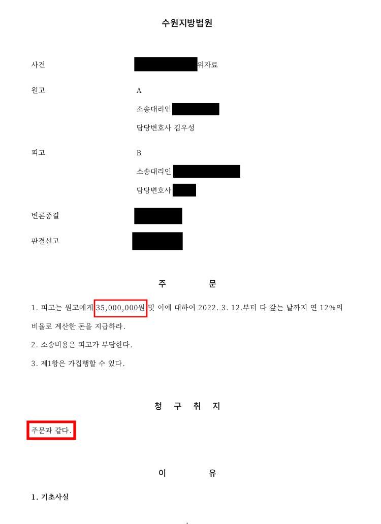하지만 본 사안에서, A(원고)는 상간녀 B(피고)를 상대로 위자료로 3,500만원을 청구하였고, 법원은 A의 청구금액 3,500만원을 전부 인용하는 판결을 하였습니다.