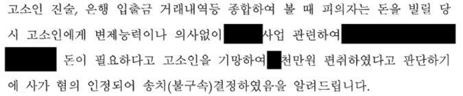 경찰은 위 사건을 수사한 결과 ‘피의자(A)는 고소인(B)으로부터 돈을 빌릴 당시 변제할 능력이나 의사 없이 고소인을 기망하여 수천만원을 편취하였다’면서 A의 사기 혐의를 인정하고, 사건을 검찰에 송치하였습니다.