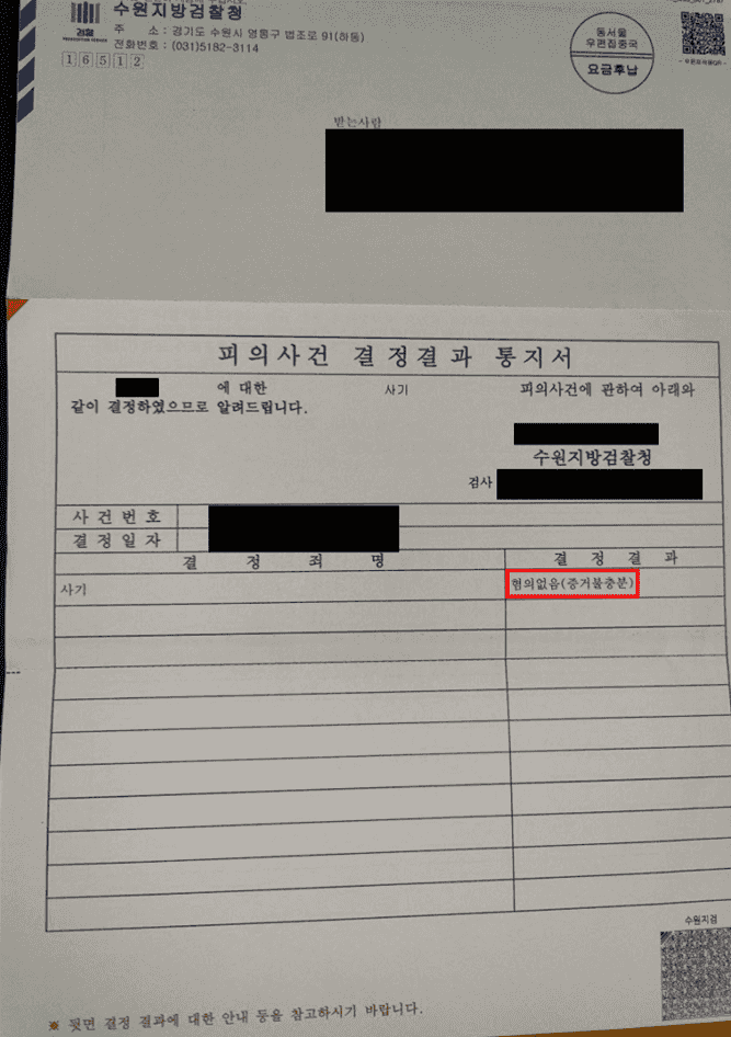 담당 검사는 변호인의 주장을 받아들여, 아래래와 같이 A의 사기 혐의 피의사실을 인정하기 부족하고 달리 이를 인정할 만한 증거가 없다면서 A에게 ‘혐의없음’ 처분을 하였습니다.