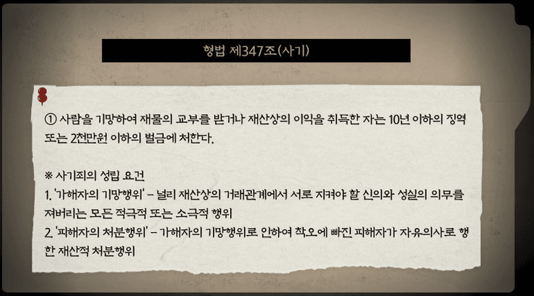 특히 대여금의 경우에는, ‘① 돈을 빌릴 당시 변제할 의사나 능력이 없으면서도, ② 돈을 빌려주면 갚을 것처럼 피해자를 기망하여, ③ 피해자로부터 돈을 지급받는 경우’ 사기죄가 성립하게 됩니다.